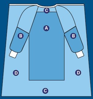 Critical Zones are defined as the areas where direct contact with blood, bodily fluids, and other potentially infectious material is most likely to happen (Areas A and B). For surgical gowns, this includes the fabric and the construction (sleeve seams, front tie attachment) in areas A and B.