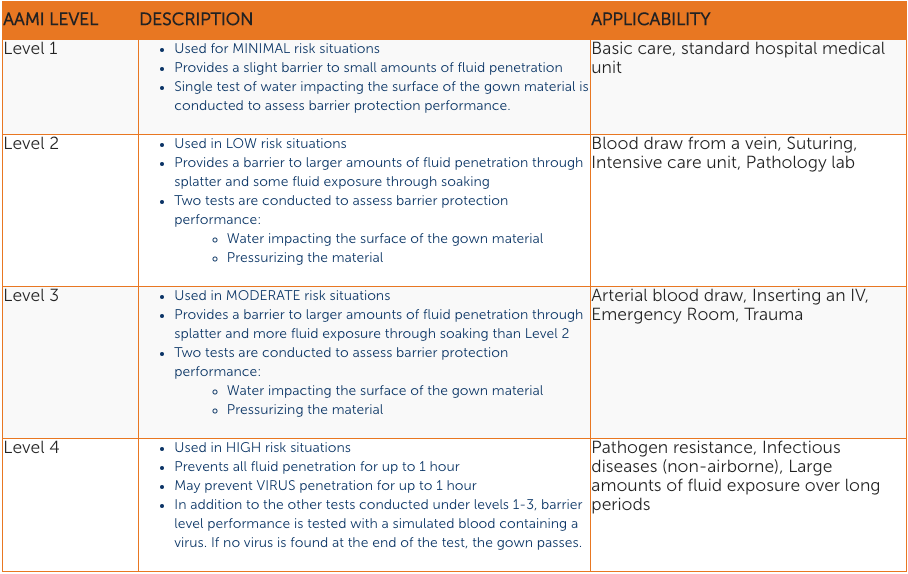 - Level 4: Highest Fluid and Microbial Barrier Protection – Provides protection against bloodborne pathogens in critical zones; used for long, fluid-intensive procedures. (This Level was strengthened by the FDA in 2016 and requires documentation of additional testing [ASTM 1671]2 on the part of gown manufacturers.)